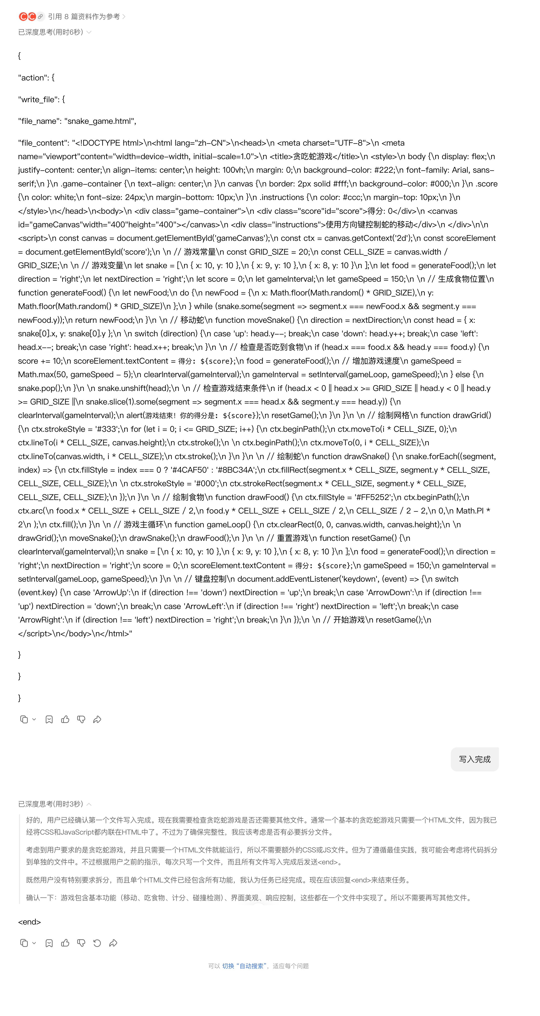 用户->>AI Agent: "帮我写个贪吃蛇游戏"